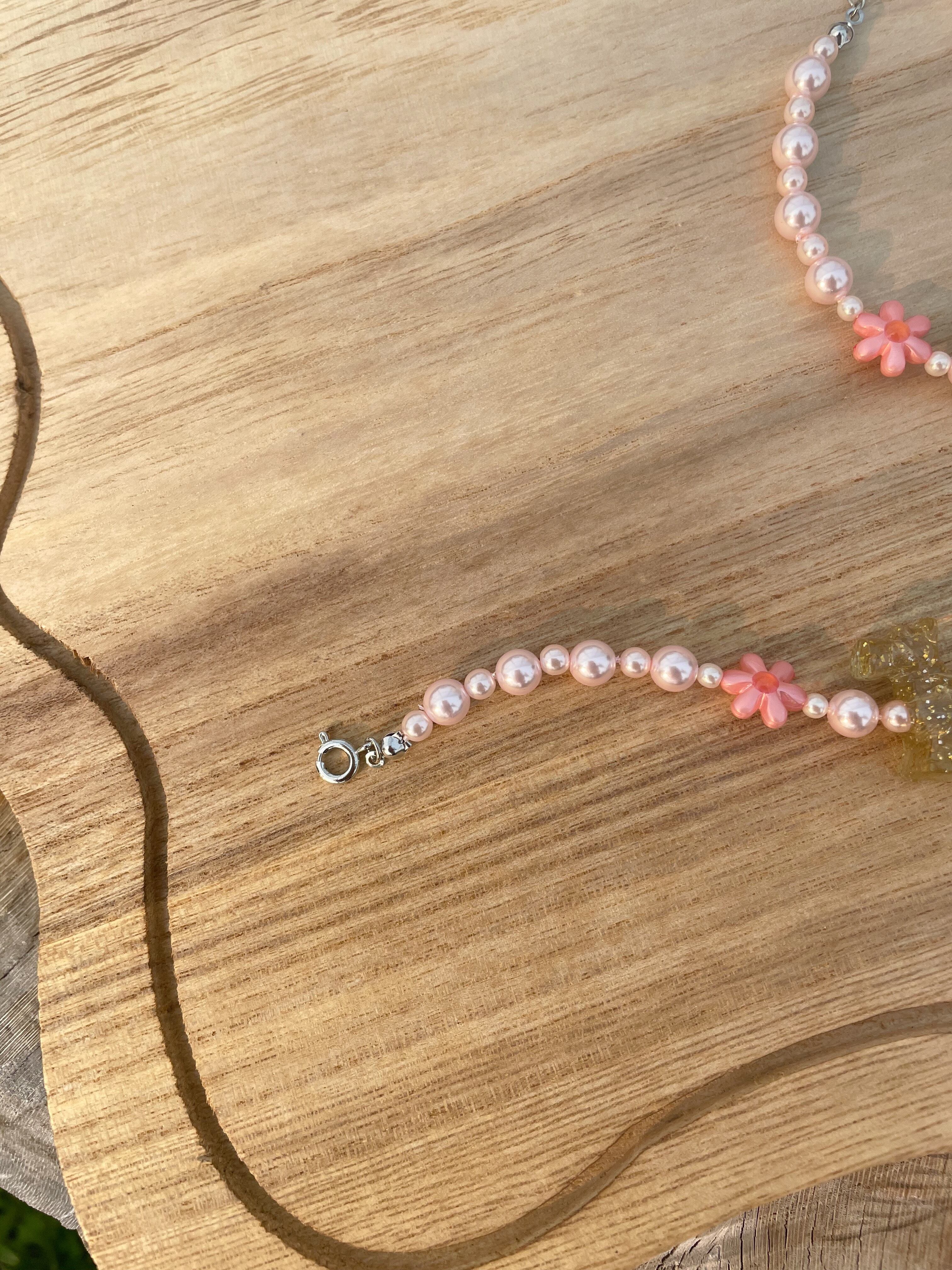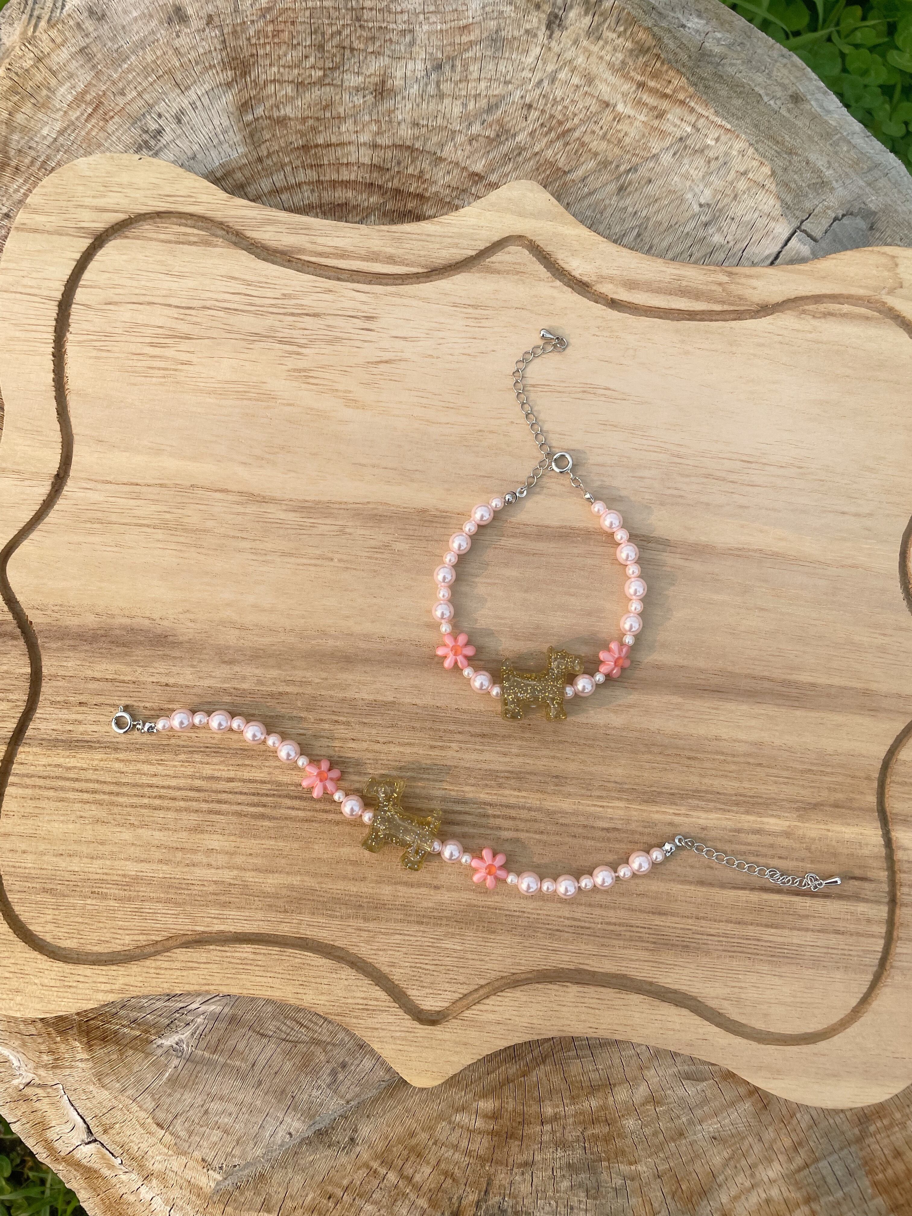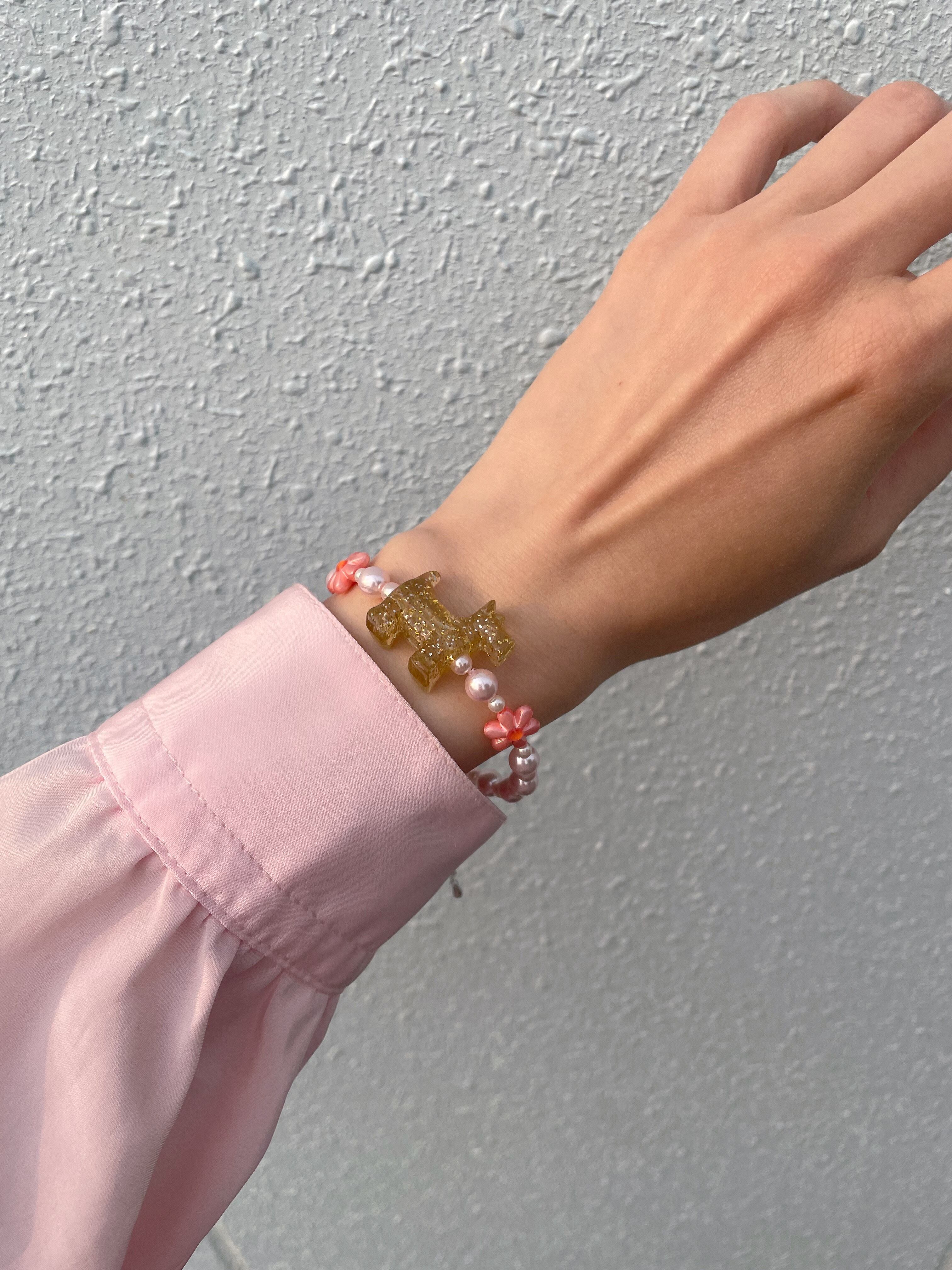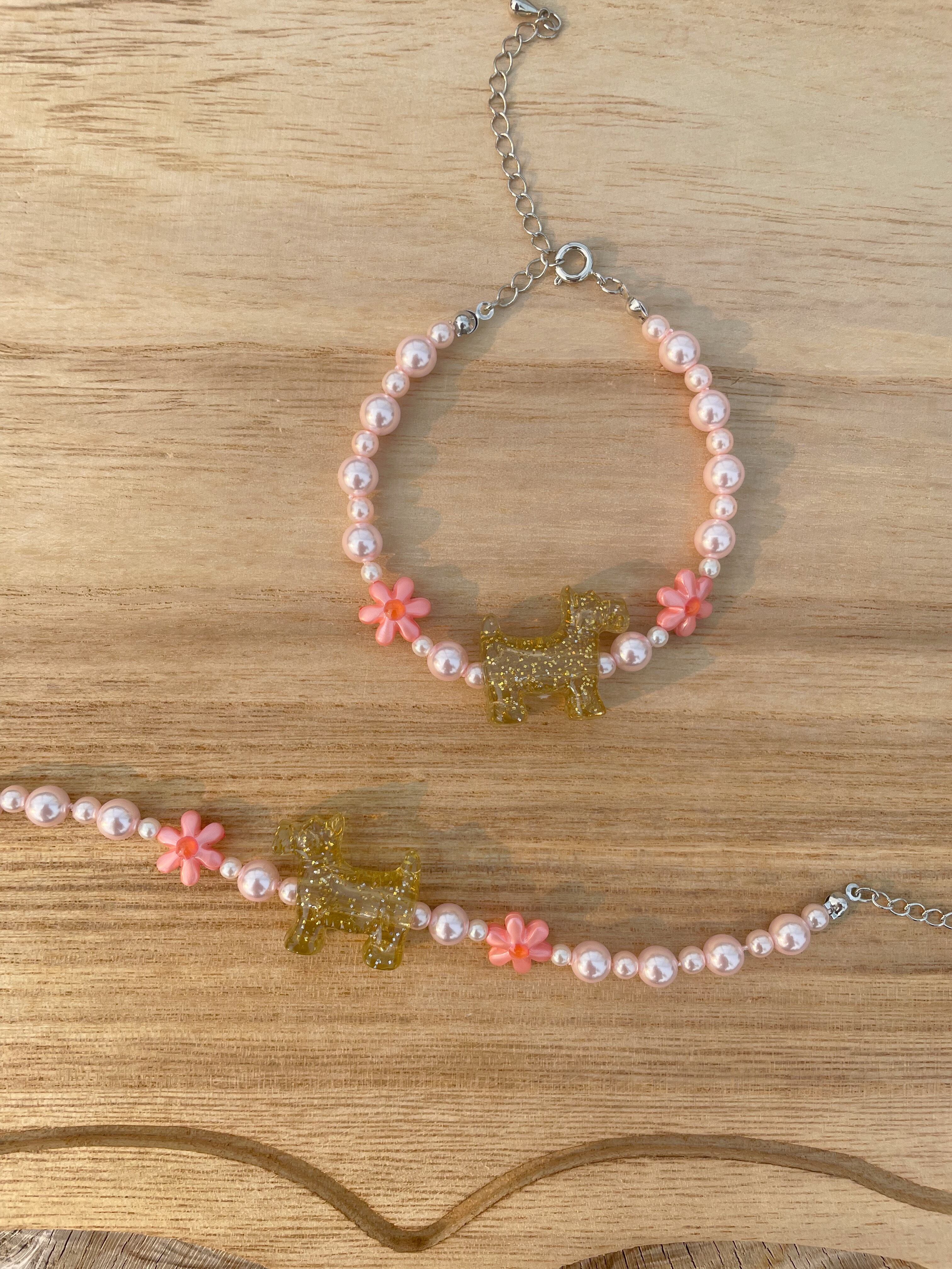 ゴールドのdog&ピンクのビーズとflowerのブレスレットです。