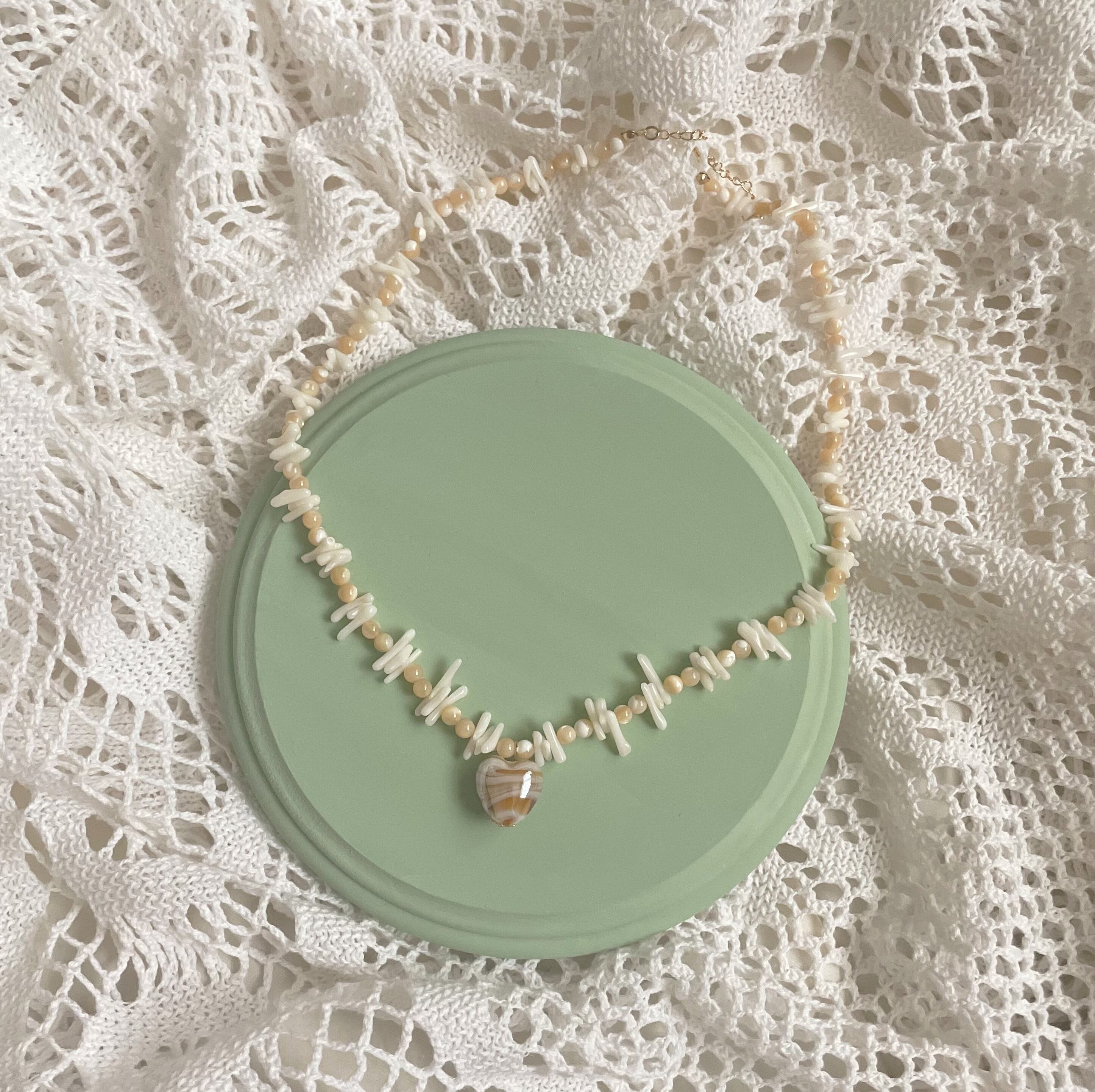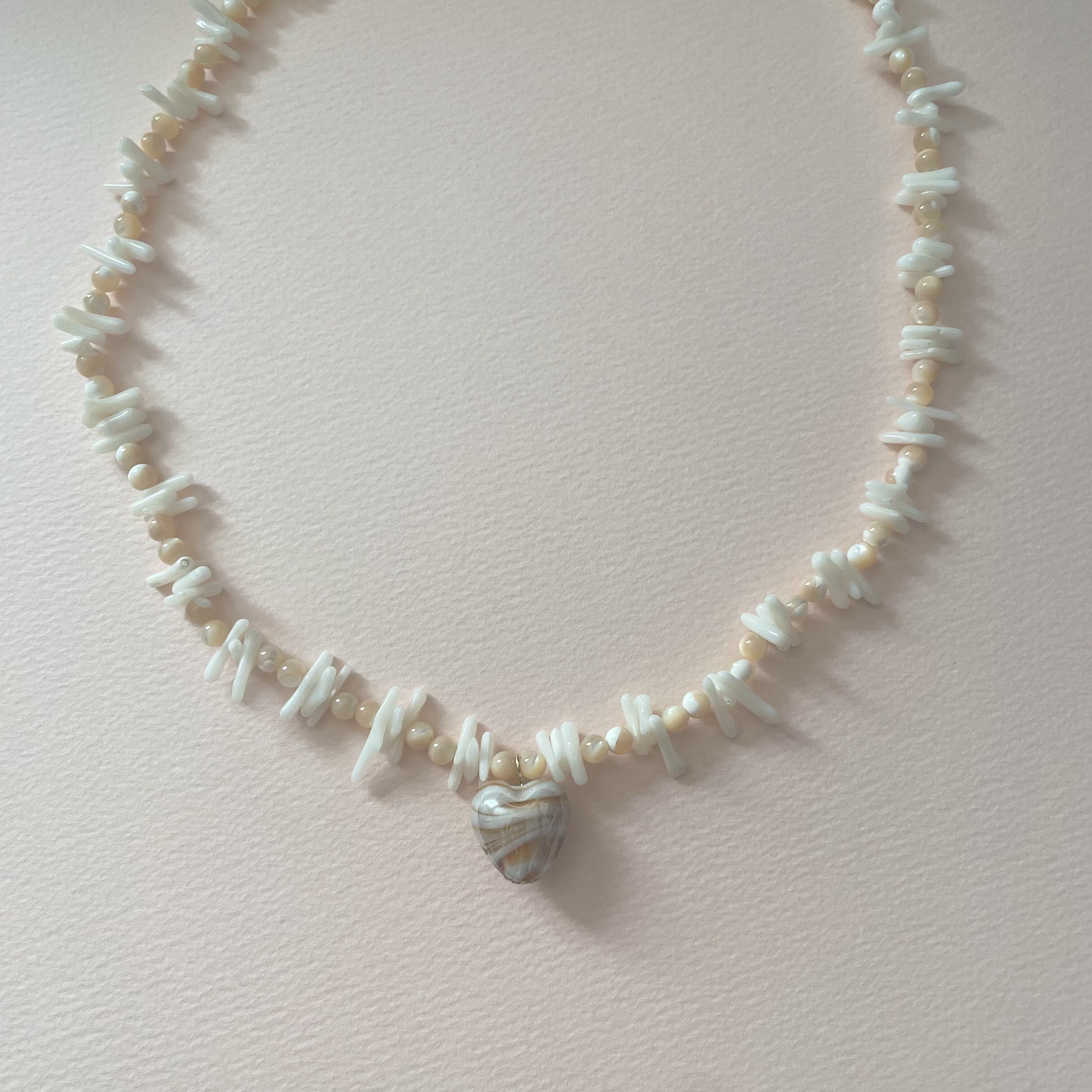 不規則なデザインがかわいいサンゴと心を癒してくれると言われているマザーオブパールを使用しております。